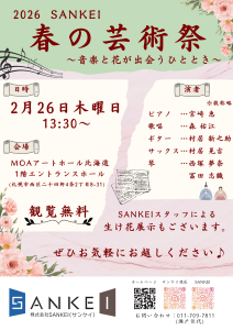 来る2/26(木) 13:30より、株式会社SANKEI様主催「春の芸術祭 ~音楽と花が出会うひととき~」が当館1階エントランスホールにて開催されます。